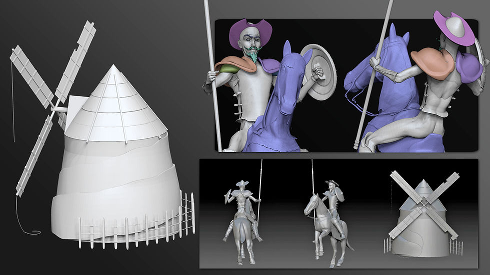 As paginas do romance formam Dom Quixote enfrentando um moinho.